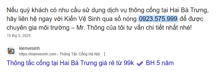 Bước 2:Tìm kiếm từ khóa: Thông tắc cống tại Gia Lâm